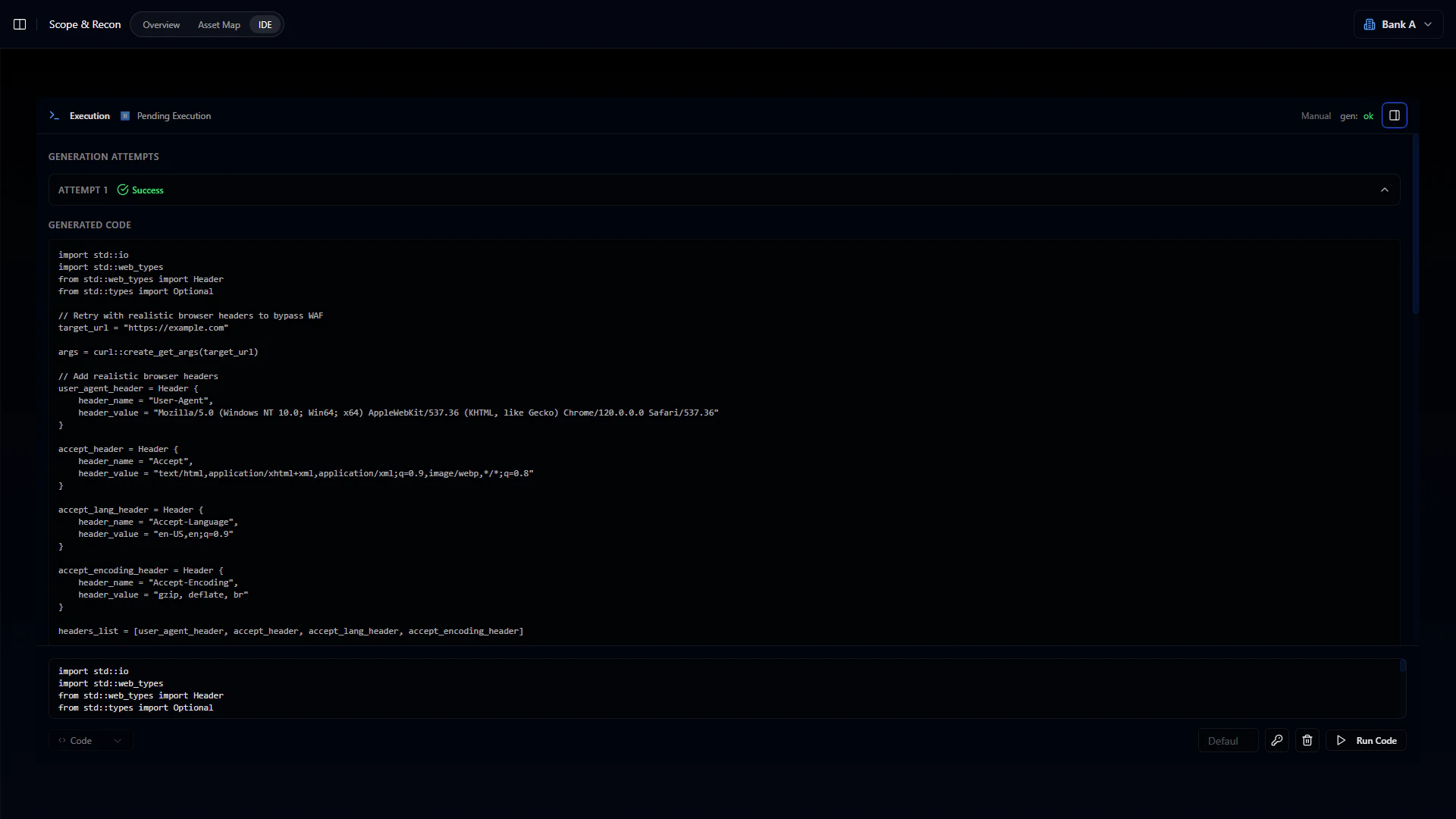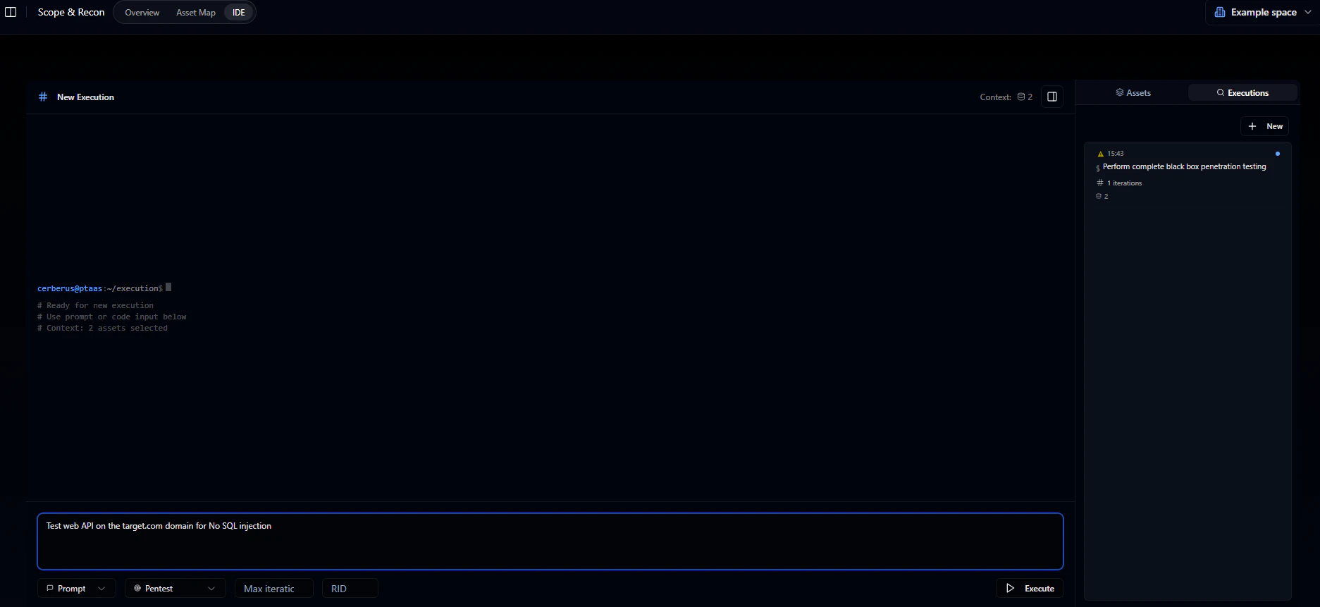 An AI system that writes and executes Cerberus code based on natural language prompts. Describe what you want - something like “test all subdomains for SQL injection” - and it generates the code, runs the tests, observes results, adapts to defenses, and produces proof-of-concept evidence. It can run for hours or days without manual intervention.