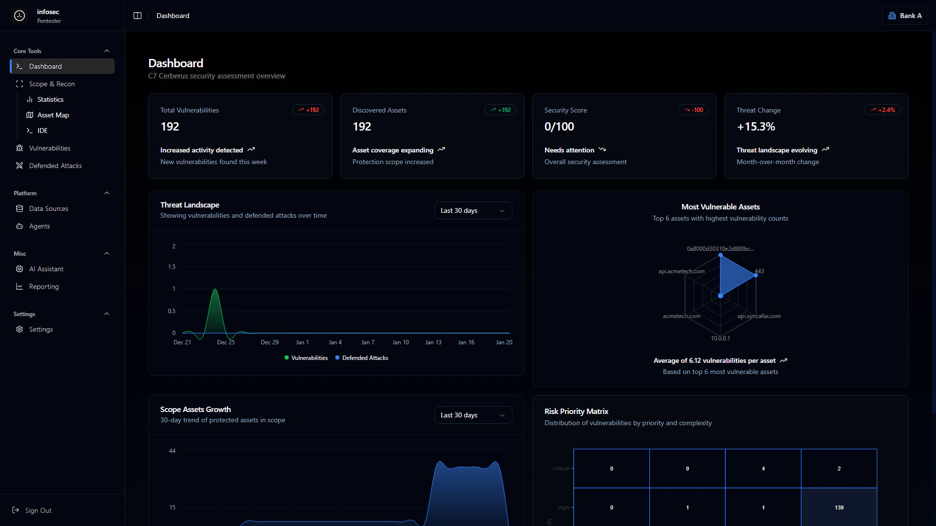 Track findings with severity scoring, remediation status, and attack vector mapping